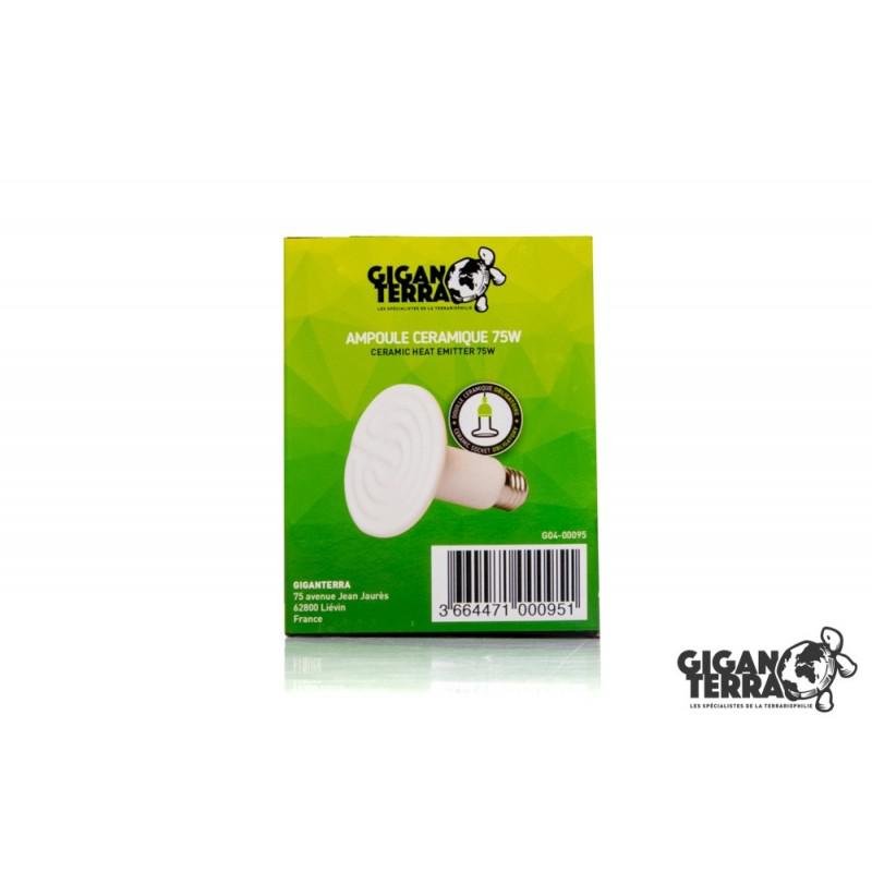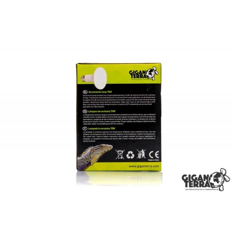 La lampara de ceramica asegura una temperatura ambiente sin emisiones de luz, que no afecta el ciclo día/noche. Se debe utilizar un termostao para regular la temperatura. Con el fin de evitar quemaduras, asegurese de que el animal no puede alcanzar la lampara. La lampara de ceramica puede durar mas de 2 años y resiste a la humedad. Tenga cuidado, esta lampara calienta mucho y usted debe utilizar un portalamparas E27 de cerámica.