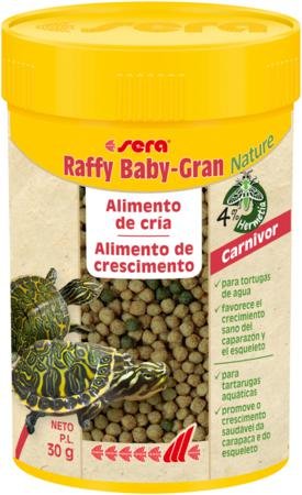 sera Raffy Baby-Gran Nature es el alimento de cría sin colorantes ni conservantes en forma de granulado elaborado conservando todas sus propiedades para reptiles carnívoros jóvenes, como las tortugas acuáticas pequeñas.