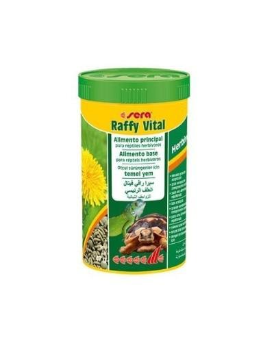El alimento principal para las tortugas de tierra y otros reptiles herbívoros La mezcla deliciosa y rica en fibras alimenticias, de gránulos de hierbas y pastillas es muy bien aceptada por todos los reptiles herbívoros. Sera Raffy Vital contiene una pequeña proporción de proteína de pez, para una alimentación equilibrada, así como para reforzar las defensas naturales. La adición cuidadosamente equilibrada de vitaminas y minerales evita, de forma segura, el reblandecimiento del caparazón y de los huesos (raquitismo). La comida está libre de colorantes y aromatizantes.