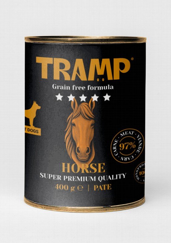 TRAMP 5* DOG GRAIN FREE HORSE es una alimentación húmeda natural para perros exigentes o con sensibilidad digestiva. Su formula monoproteica y libre de cereales facilita la digestión y reducir las intolerancias.